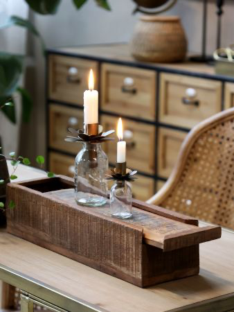 Disponible en deux tailles complémentaires, il s'intègre parfaitement dans une décoration bohème, naturelle ou transitionnelle. Que ce soit sur une étagère, une table de salle à manger ou en centre de table, ce bougeoir crée une ambiance chaleureuse et raffinée grâce à sa flamme douce et à son design original mêlant métal et verre.
