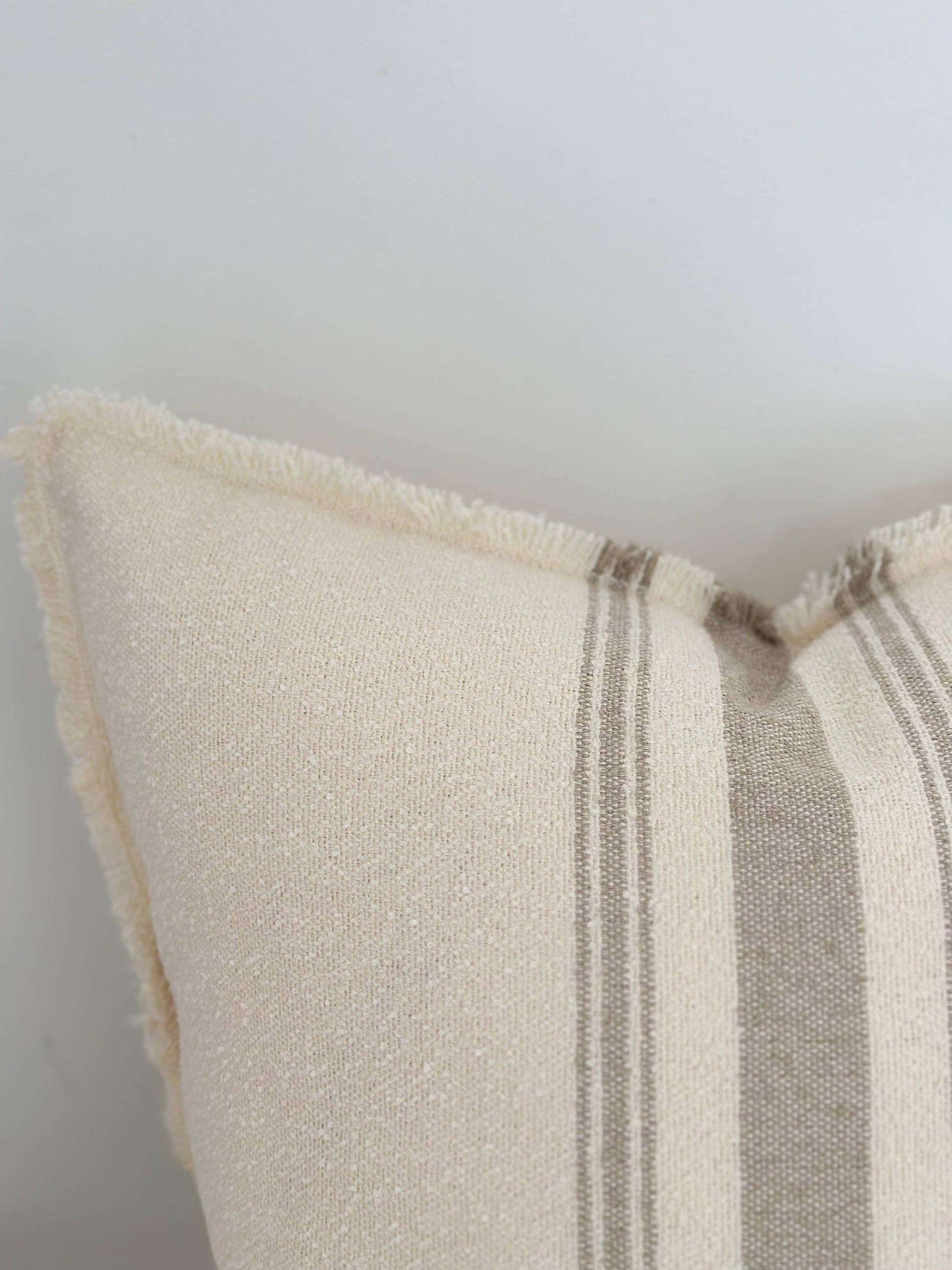 Coussin élégant en polyester avec bord à volant et motif crème & grège. Sa texture douce et sa fermeture éclair cachée en font un accessoire discret mais raffiné. Garnissage en plumes de canard pour un confort optimal.