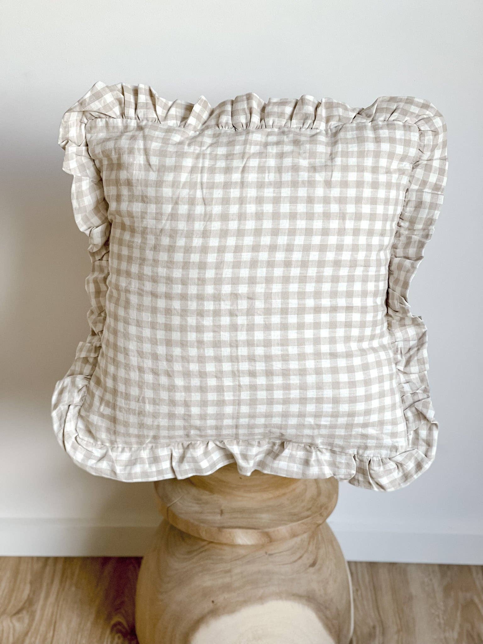 Coussin en pur lin français vichy beige, orné de jolis volants pour une touche romantique. Housse en 100 % lin et garnissage polyester inclus.