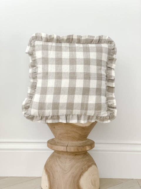 Apportez une note chic et naturelle à votre intérieur avec ce coussin en lin à carreaux écrues et beiges naturels, subtilement rehaussé de volants délicats. Garnissage en plume pour un confort absolu.