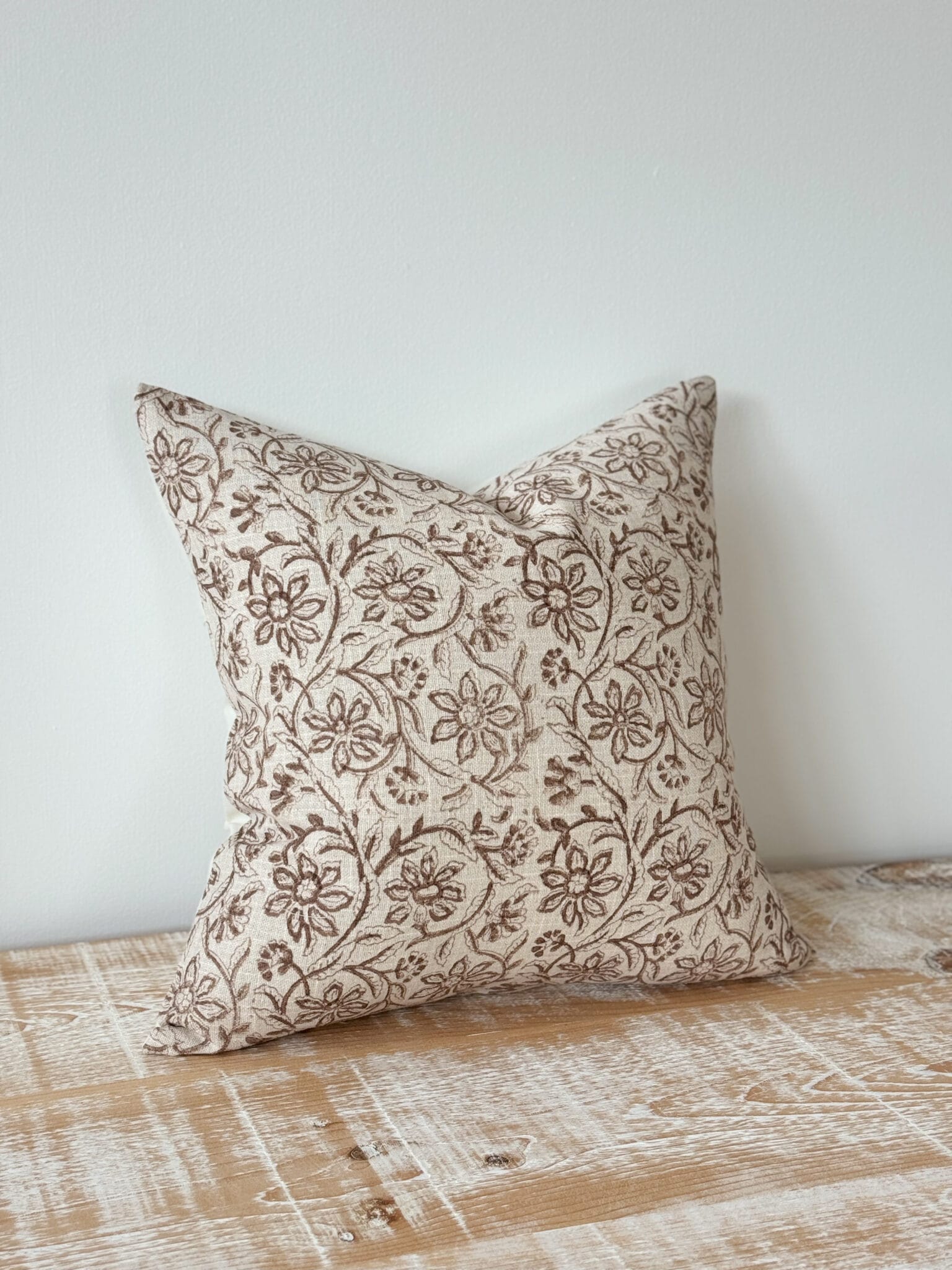 Housse de coussin Ivy marron en coton 100% avec imprimé floral rustique réalisé en block-print artisanal. Sa teinte marron et son motif intemporel en font une pièce forte, parfaite pour toutes les saisons.