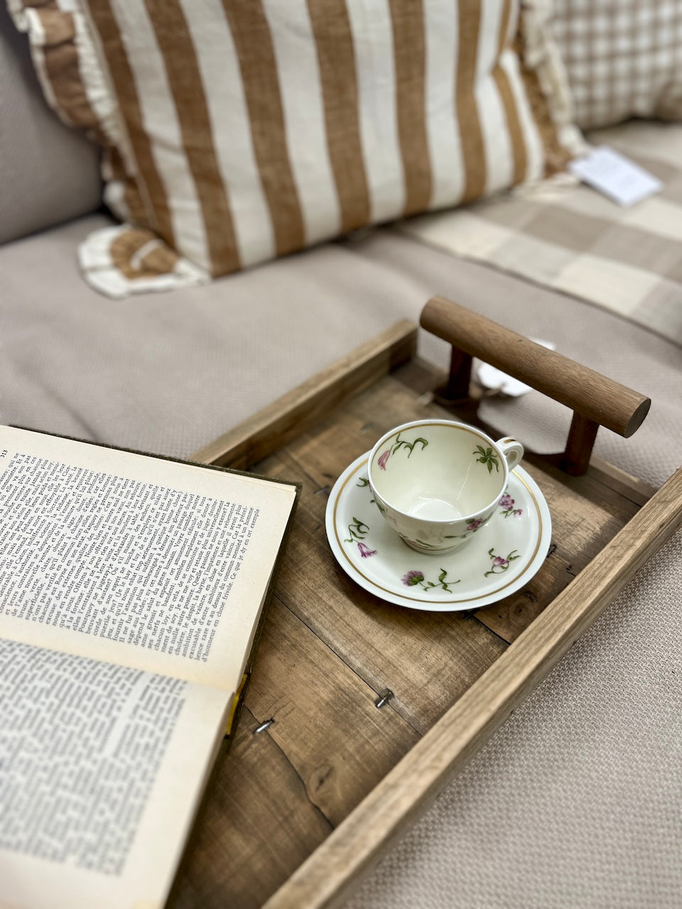 Chacune de ces tasses, en porcelaine fine blanche, est délicatement ornée d’un motif floral rose ancien et soulignée d’un filet doré, typique du raffinement des années 1930 à 1950. Leur format est parfait pour le café, l’espresso ou même un petit thé.