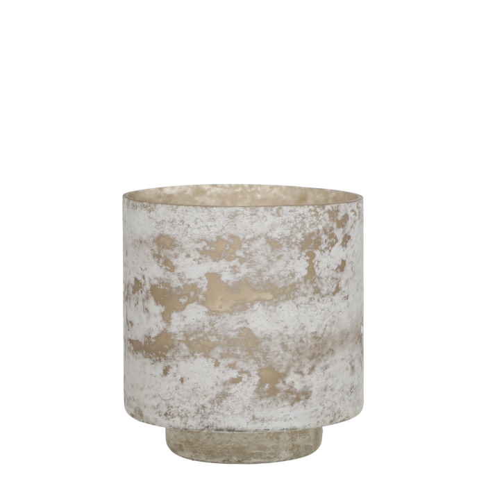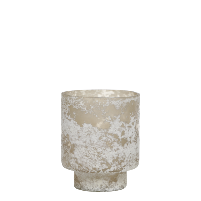 Apportez une touche de douceur et de raffinement à votre intérieur avec ce photophore en verre blanc à l'effet antique délicatement travaillé. Sa finition patinée et son design sobre en font une pièce intemporelle, idéale pour diffuser une lumière tamisée lors de vos soirées.