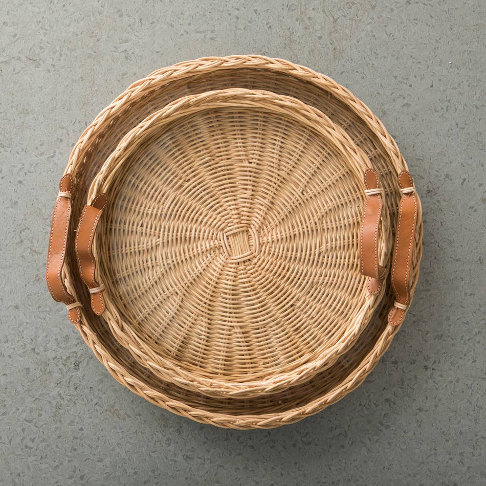Plateau rond en rotin avec poignées en cuir