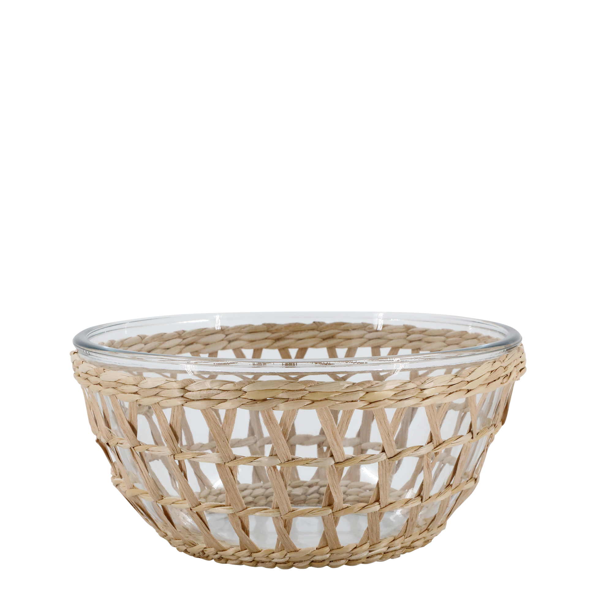 Saladier en verre avec panier tressé en osier naturel, à la fois élégant et pratique. Existe aussi en format bol assorti.