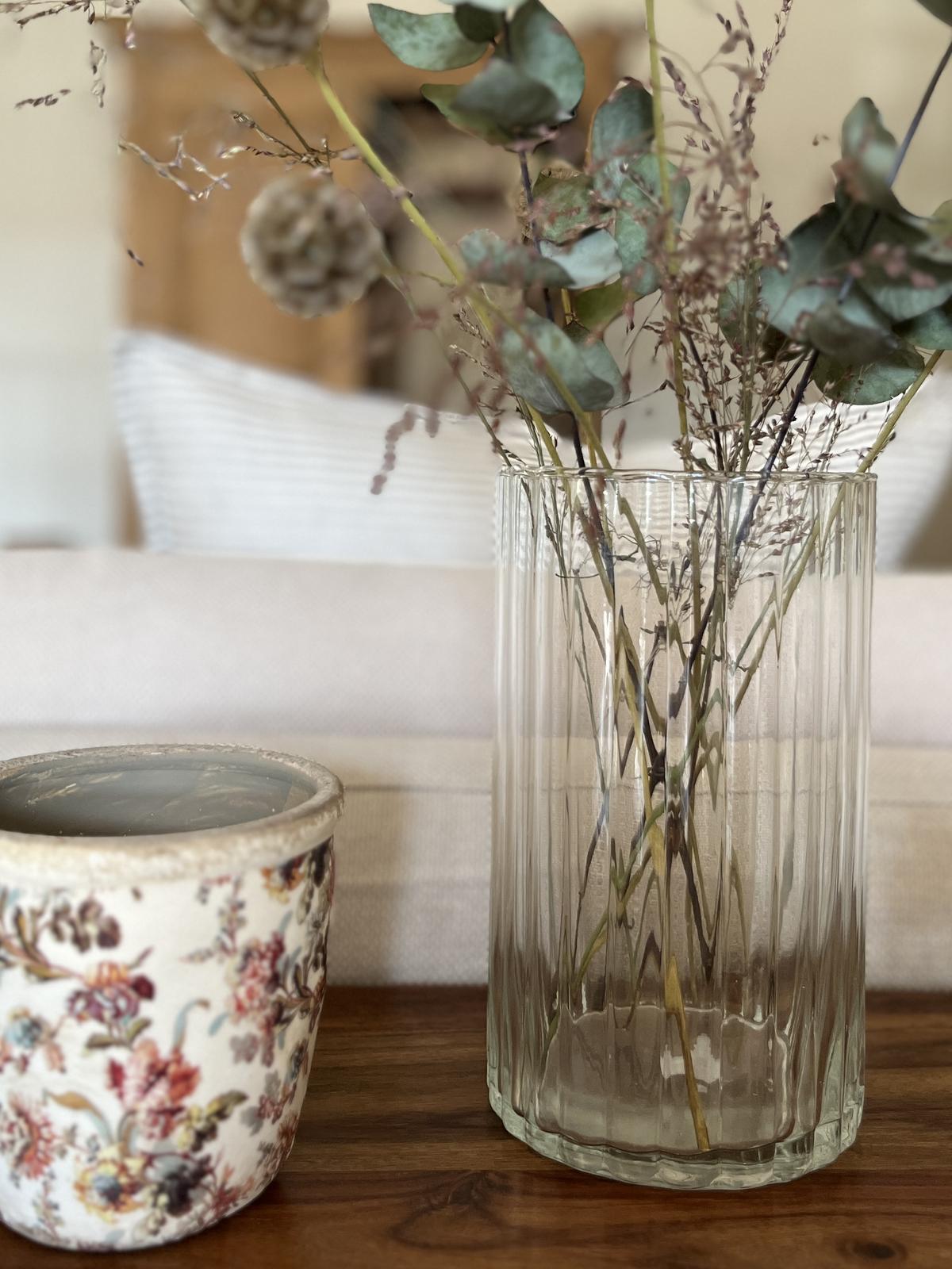 Un vase en verre élégant au design cannelé, parfait pour mettre en valeur vos bouquets secs ou fleurs fraîches dans un esprit sobre et raffiné.