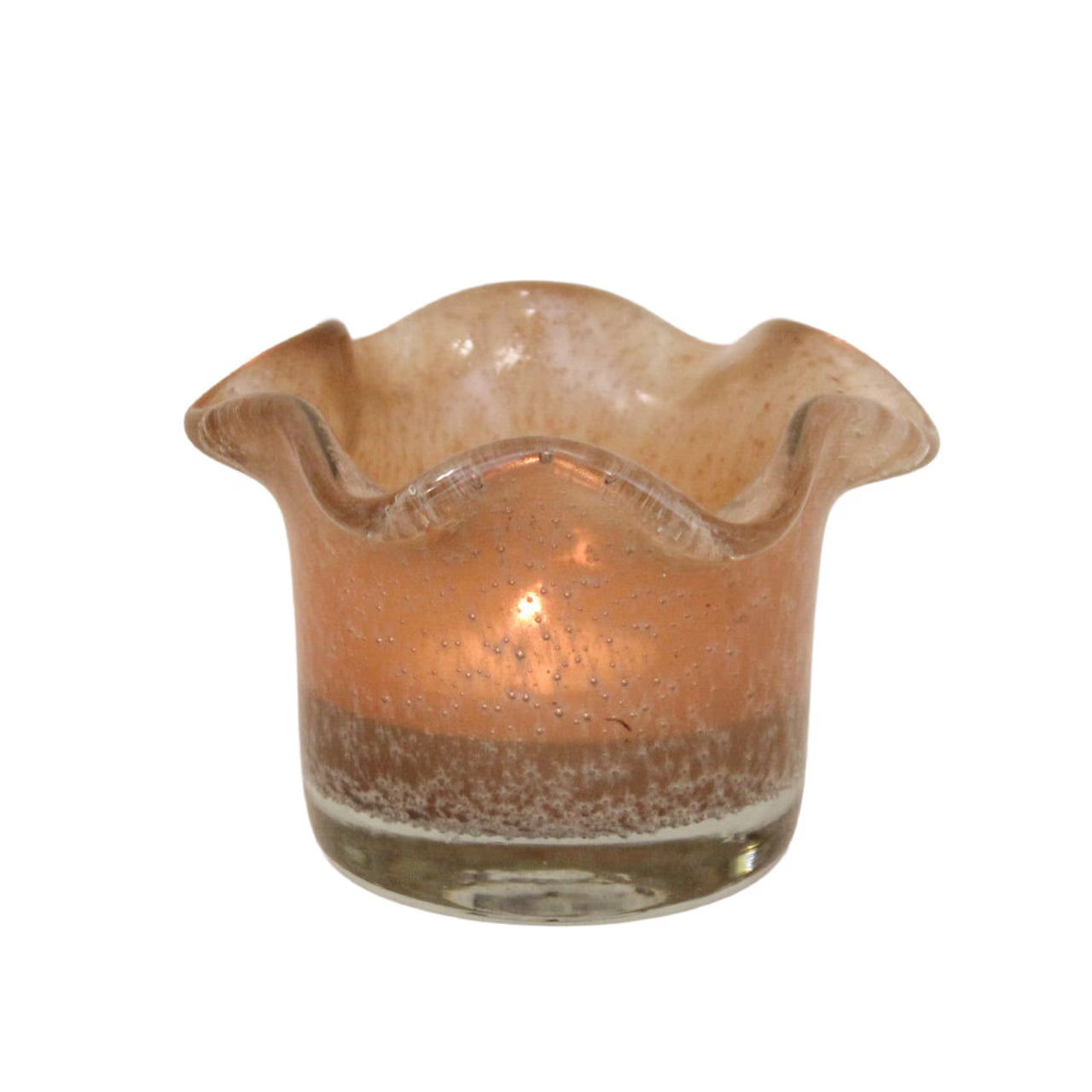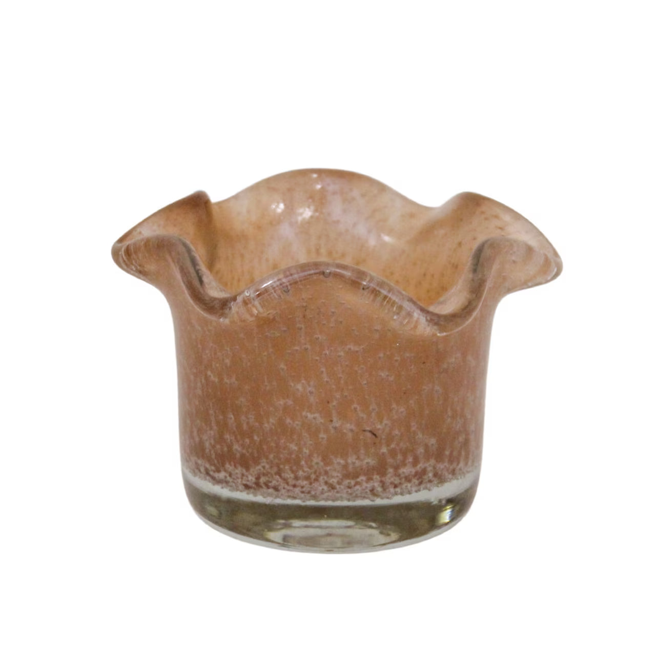 Photophore en verre recyclé (50–60 %) pour bougies chauffe-plat, aux bords ondulés et teinte brun clair chaleureuse. Crée une ambiance cosy dans toutes les pièces.