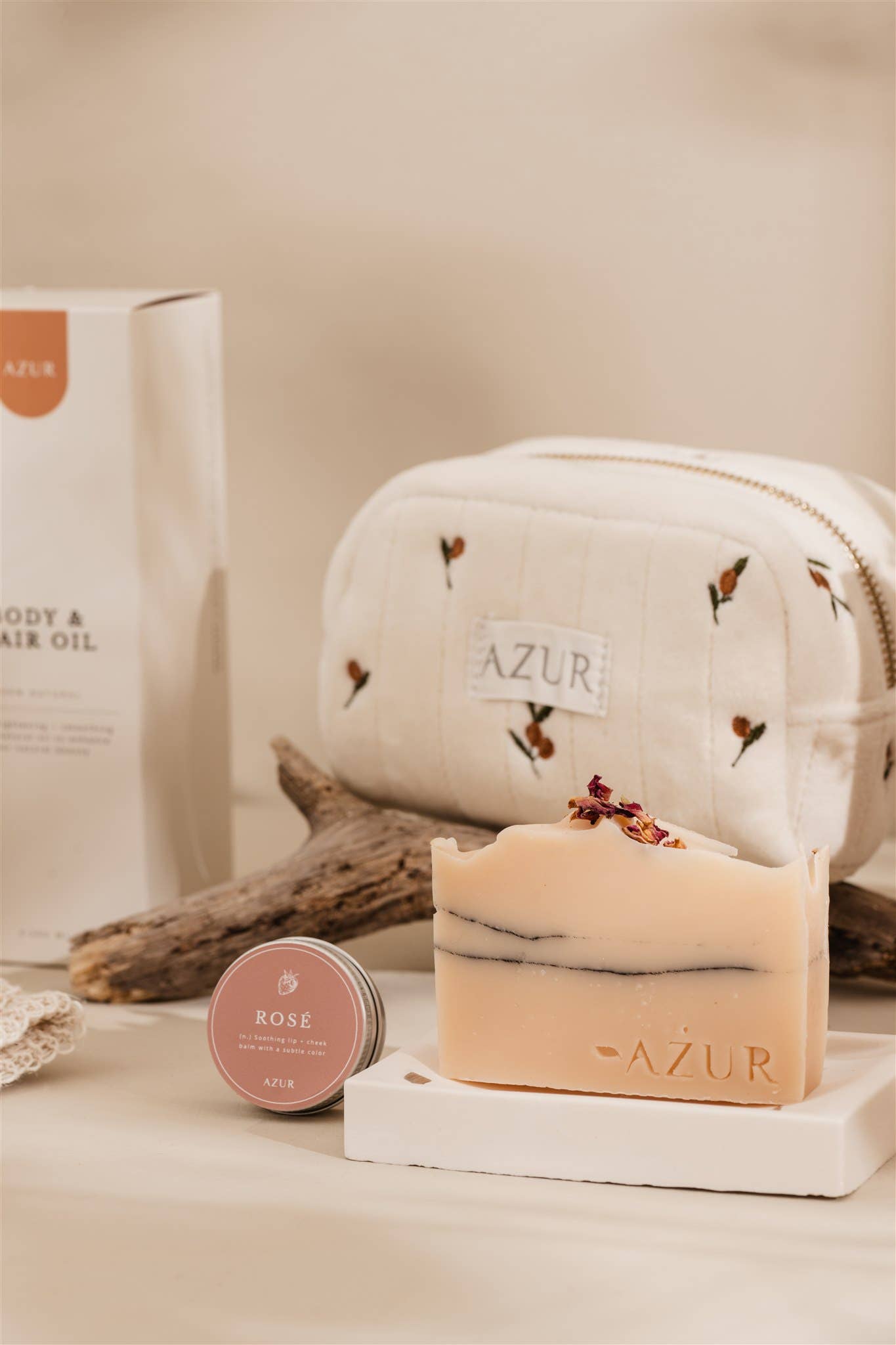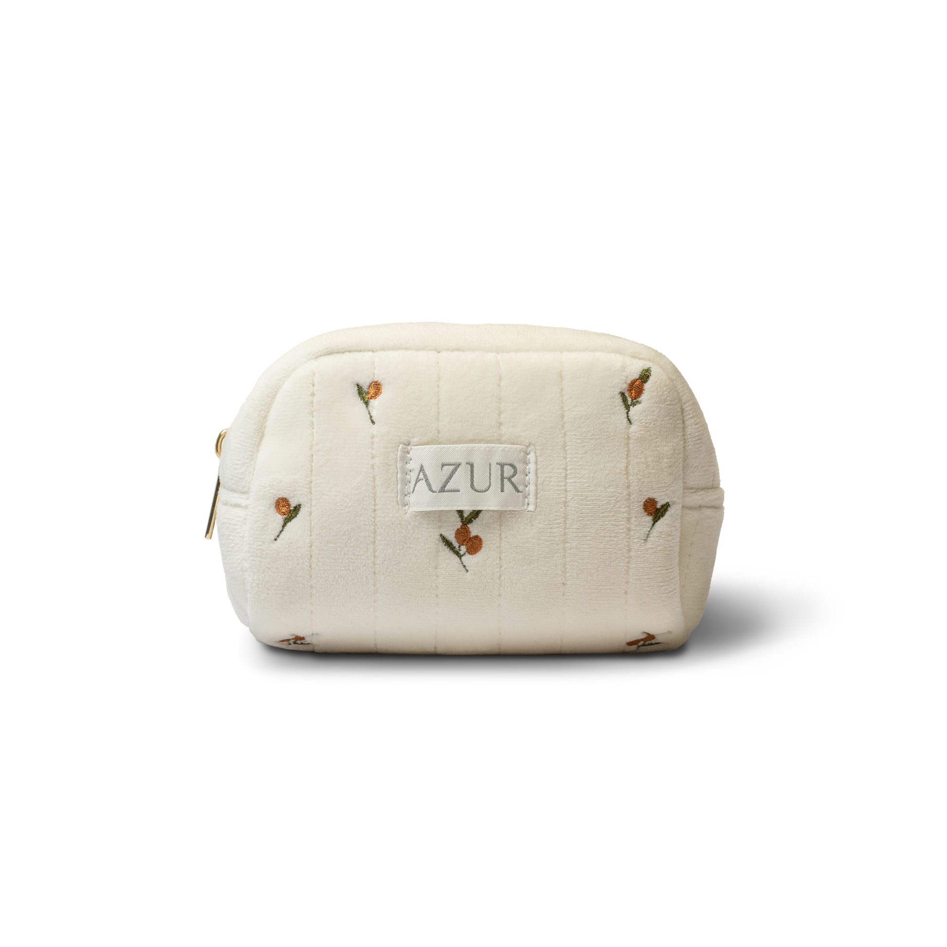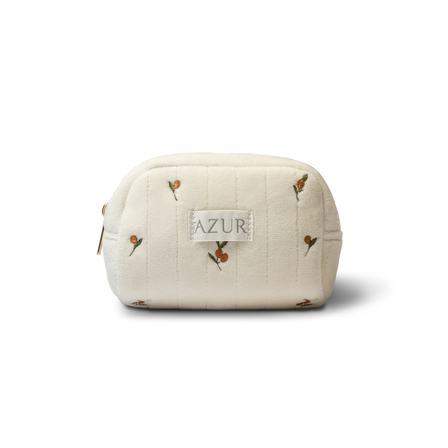Découvrez notre trousse de maquillage Azur exclusive, confectionnée à la main avec soin.