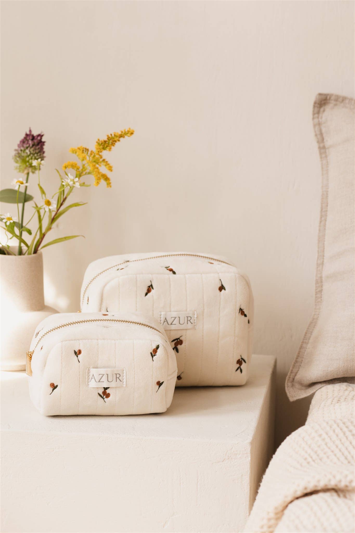 Trousse de maquillage en velours de coton brodé, fabriquée à la main. Pratique, élégante et sans plastique. Format voyage idéal : 15 × 8 × 11 cm.